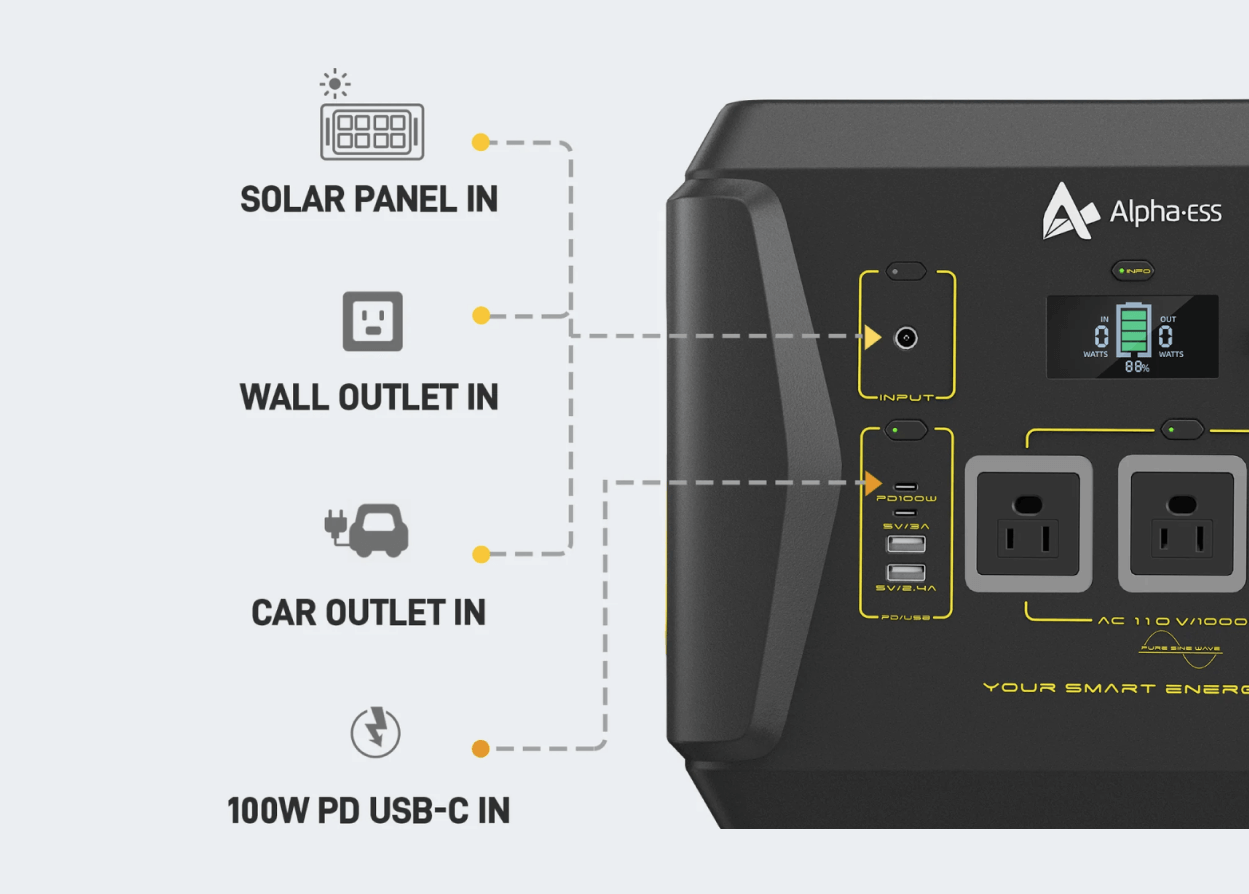 Whether you're off-grid, on the road, or at home, the BlackBee 1000 offers multiple recharging options to keep you powered up. Recharge via solar panel, wall outlet, car outlet, or 100W USB-C, ensuring your power station is ready for any adventure or emergency.